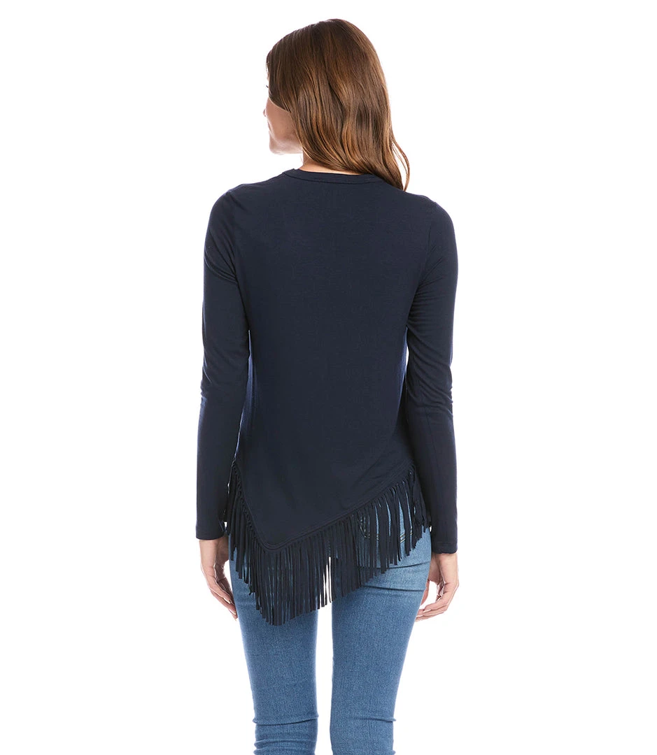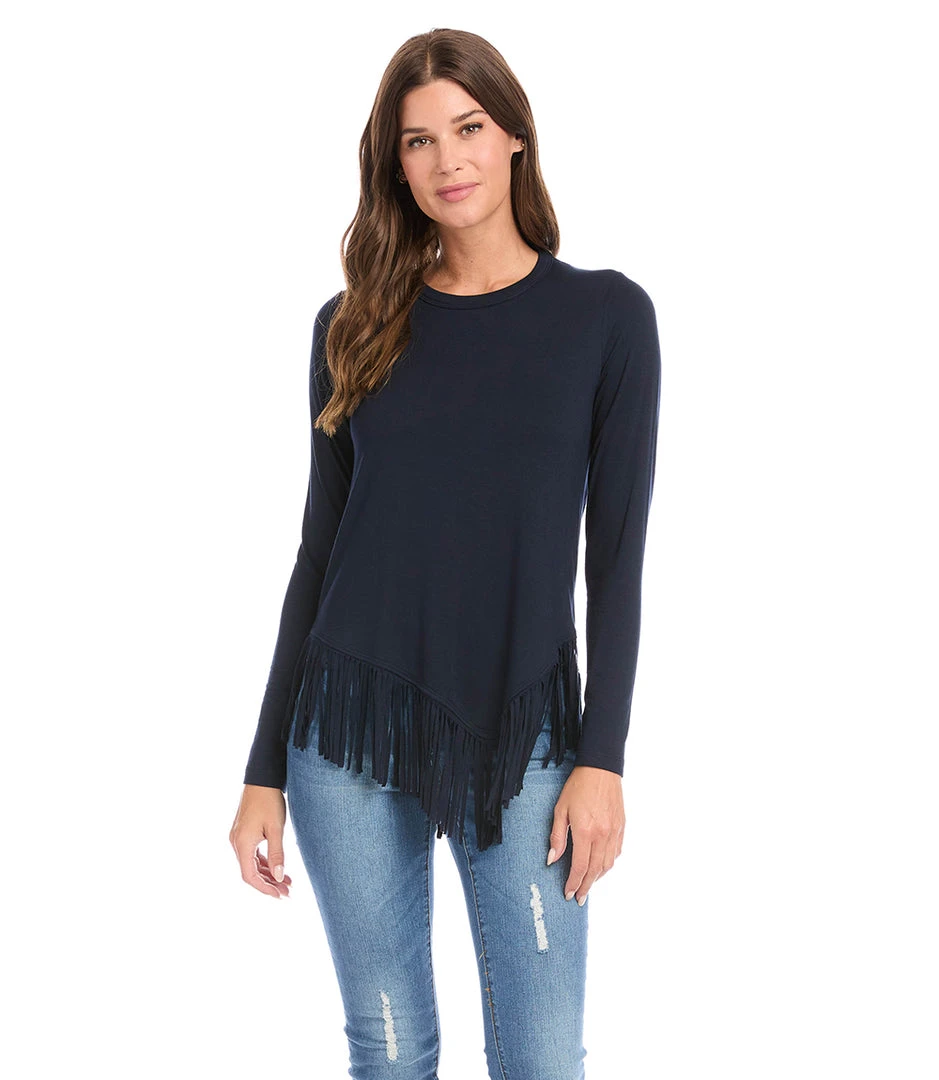Swishy fringe details the hem of this super soft top cut from jersey-knit. This top can easily transition from desk to dinner with a simple switch of shoes and accessories.