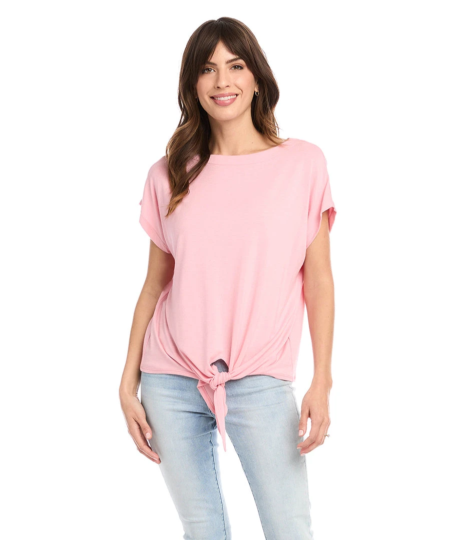 - Elevate your style with the Karen Kane Boatneck Tie Front Top, featuring a chic boatneck design and a flattering tie-front detail.