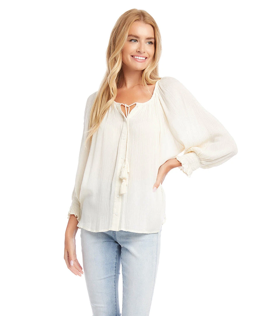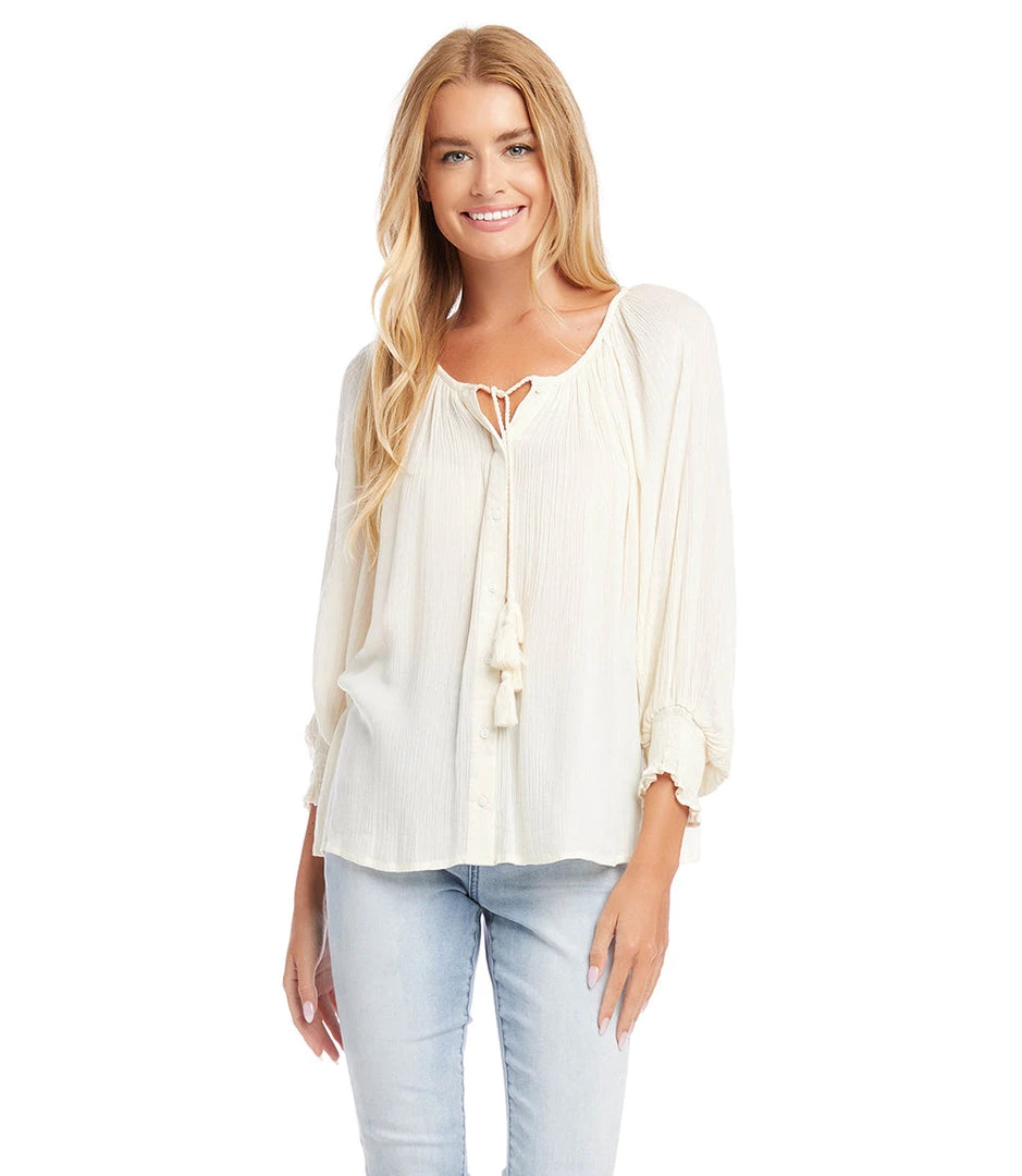 - Available in a range of colors to suit your personal style. The Karen Kane Button-Up Peasant Top is perfect for everyday wear, weekend outings, or casual gatherings.