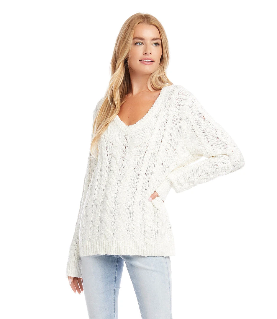 - Experience ultimate comfort with the Karen Kane Cable Knit Sweater, crafted from soft, high-quality materials for a luxurious feel.