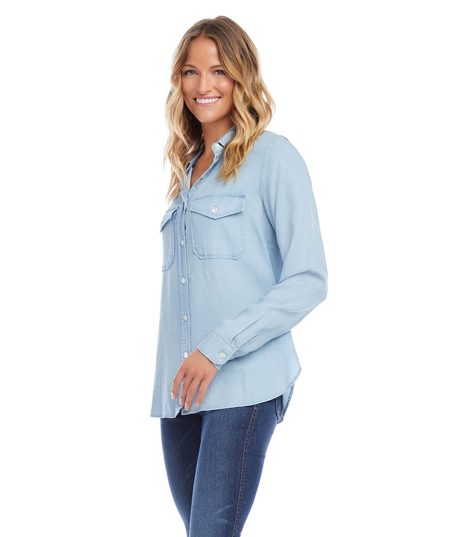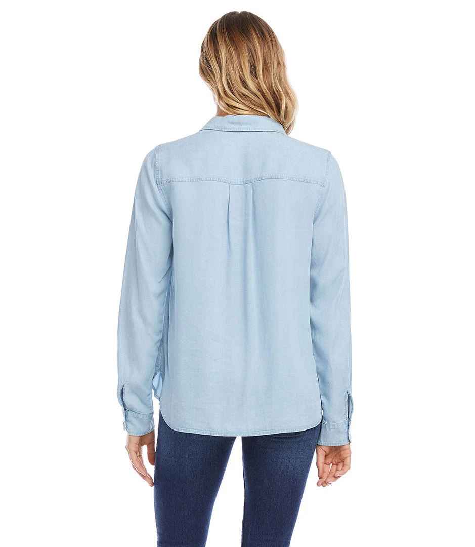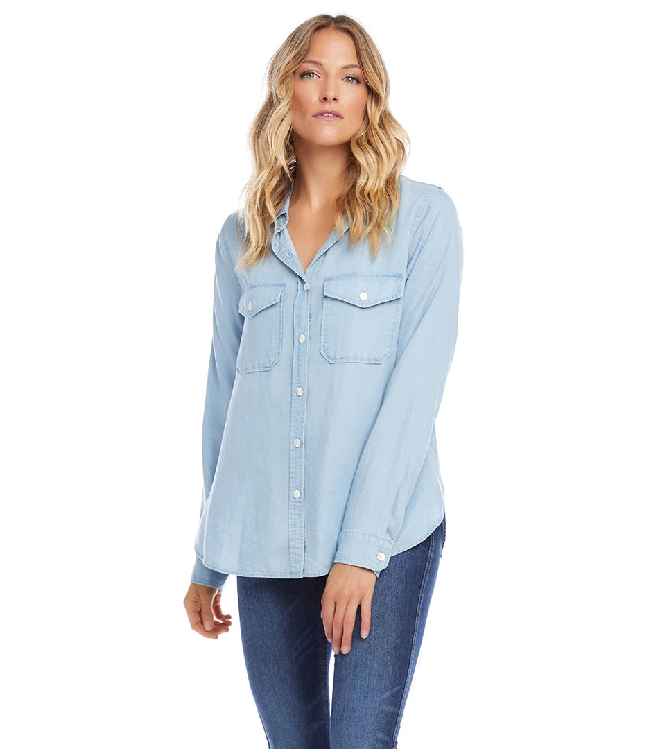 - Elevate your wardrobe with the Karen Kane Chambray Shirt. This versatile top combines style and comfort, making it perfect for any occasion.