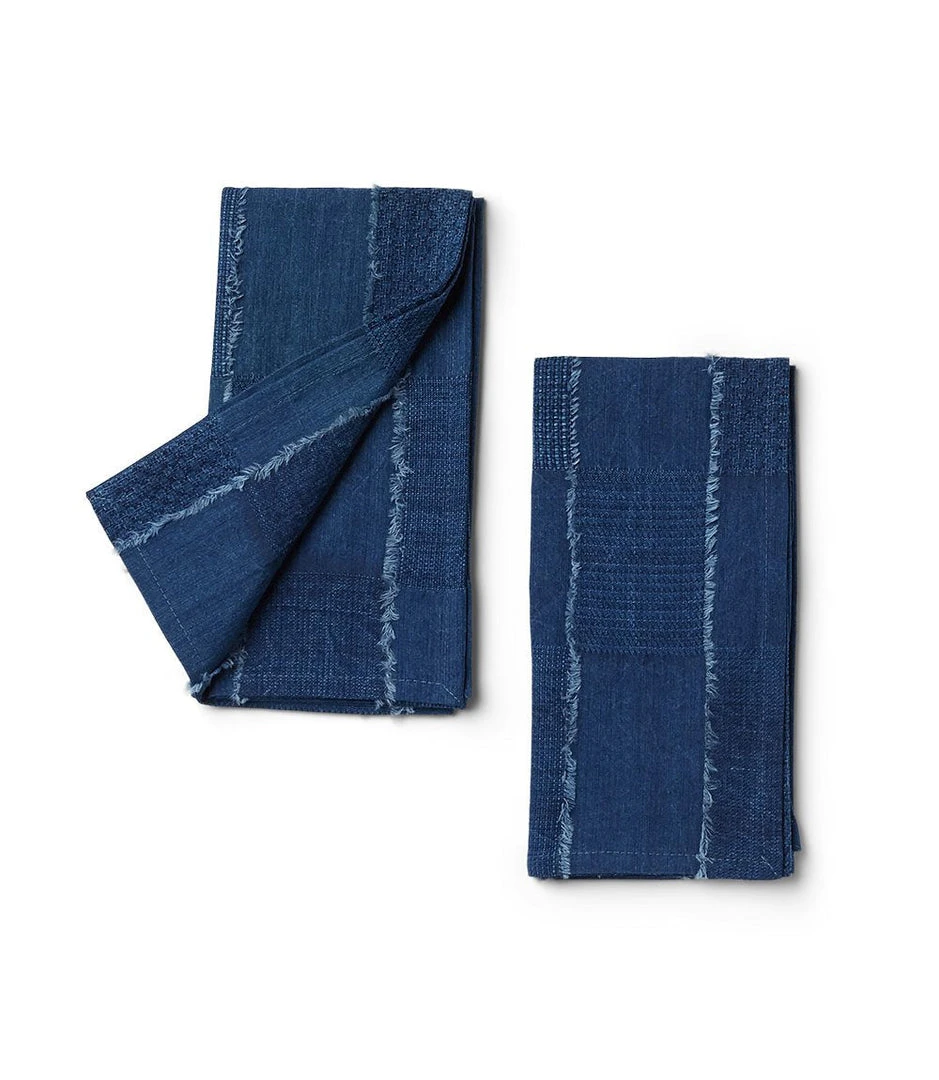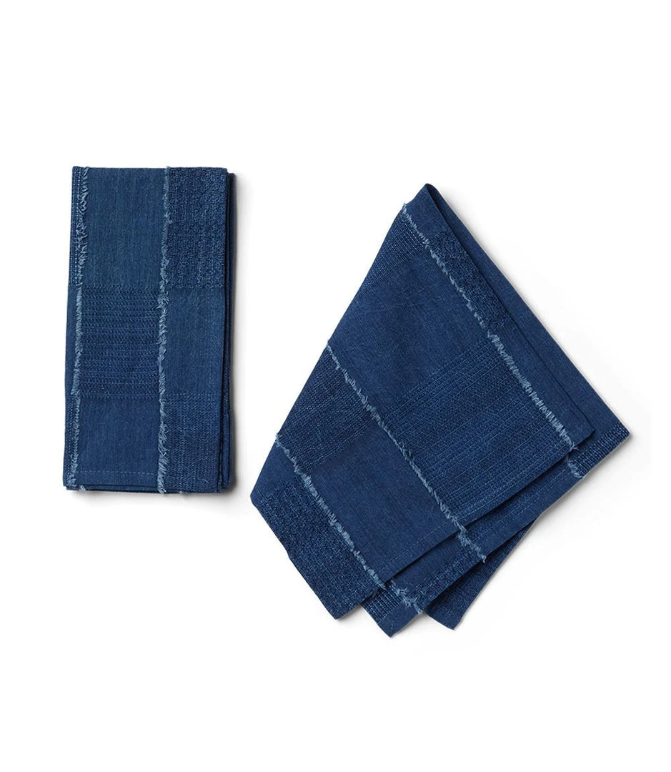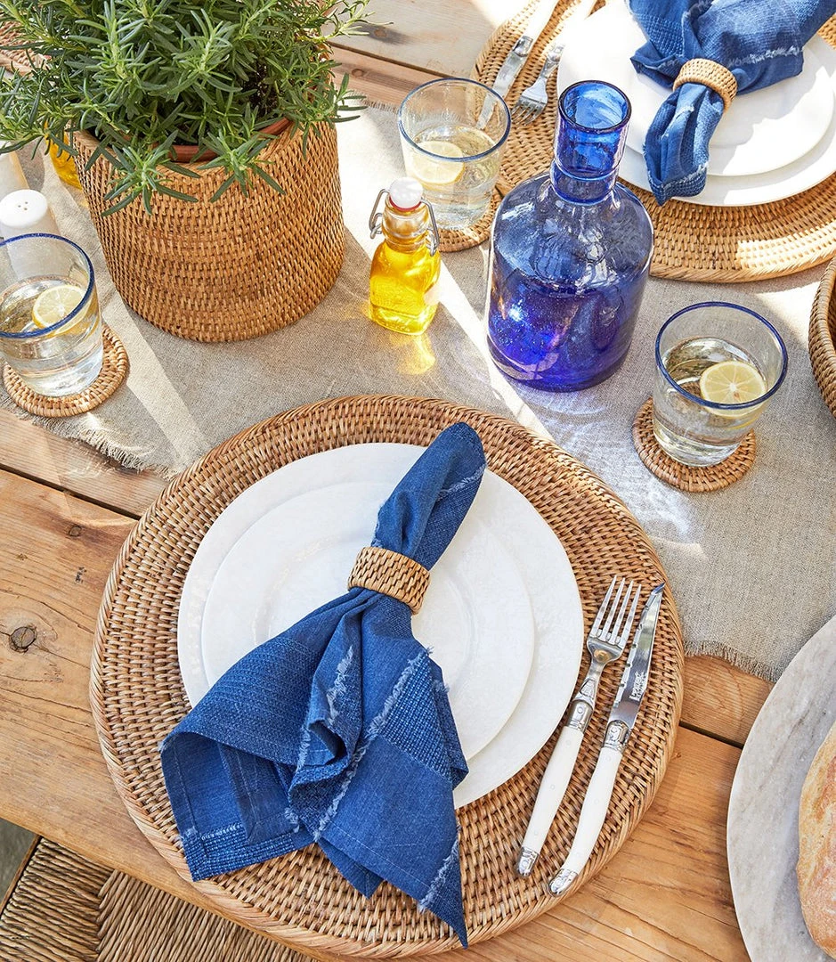 Designed and crafted in Los Angeles, this 100% Cotton napkin set features a charming patchwork finished with feathered fringe seams. Complete the look with our rattan napkin rings for a stunning dinner tablespace. Due to the natural characteristics of this item, each piece will have variances, no two are the same.