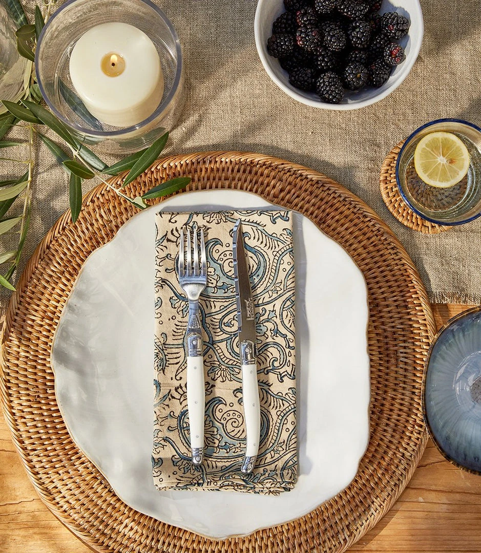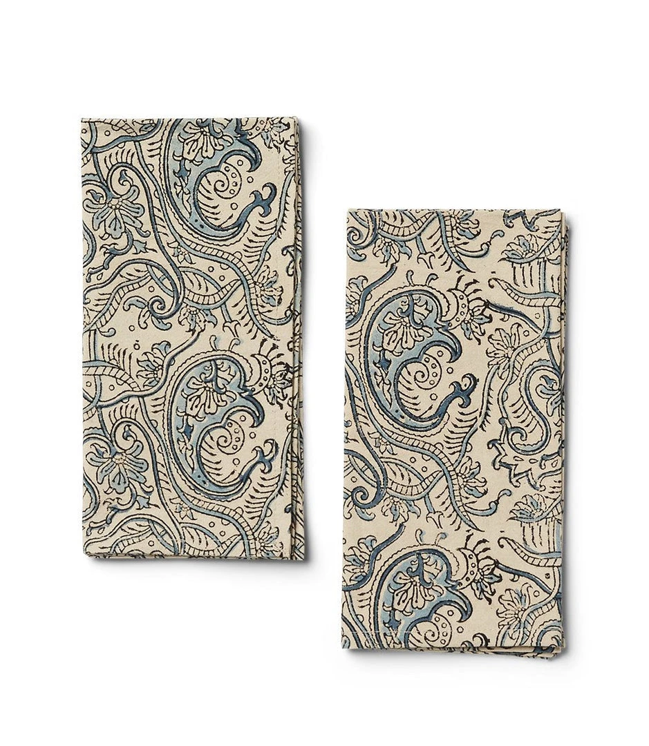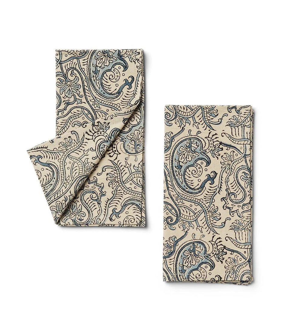 Designed and crafted in Los Angeles, this 100% Cotton napkin set is covered in an elegant paisley print. Complete the look with our rattan napkin rings for a stunning dinner tablespace. Due to the natural characteristics of this item, each piece will have variances, no two are the same