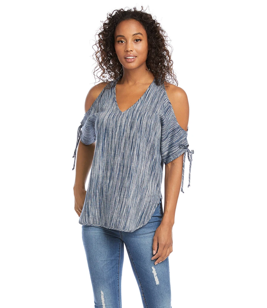 - Elevate your style with the Karen Kane Cold Shoulder Tie-Sleeve Top, designed for comfort and sophistication. This top features unique tie-sleeve details and a flattering cold shoulder design, making it a must-have for any fashion-forward woman.