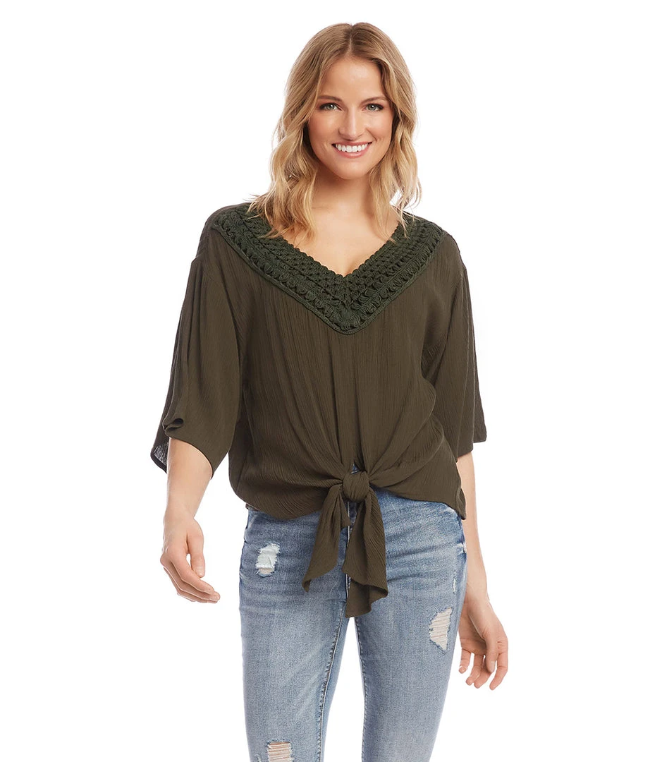 - Don’t miss out on this trendy and comfortable Karen Kane Crochet Neck Tie-Front Top. Add it to your cart now and experience the perfect blend of style and comfort!