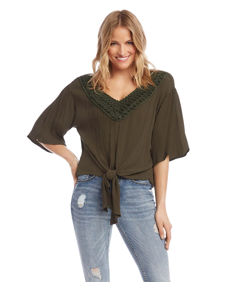 - Elevate your summer wardrobe with the Karen Kane Crochet Neck Tie-Front Top. This stylish blouse features a crochet neckline and a tie-front design, offering a perfect blend of comfort and fashion.