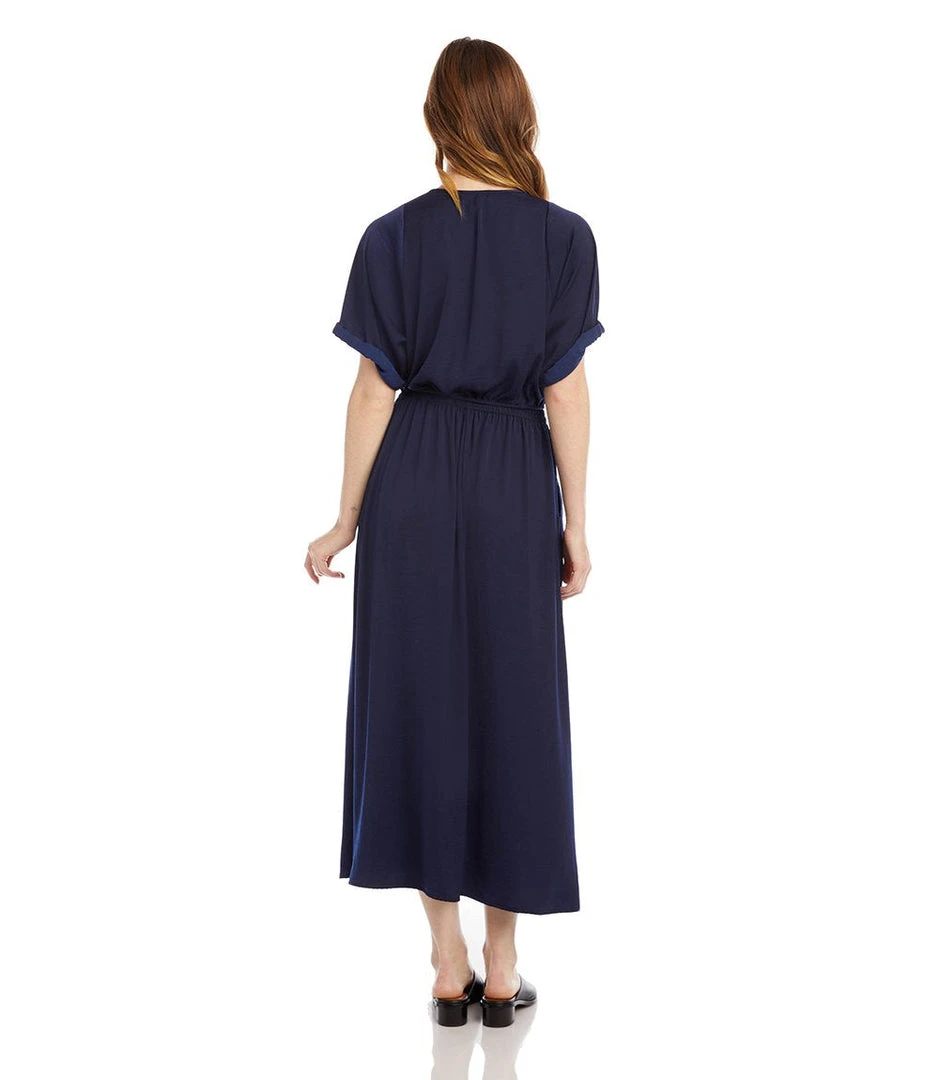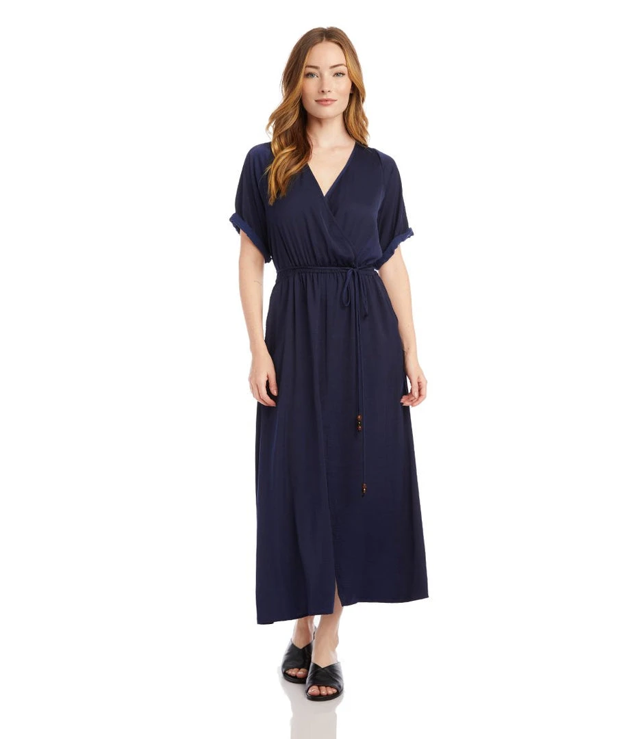 Indulgently smooth, this breezy dress features extended roll sleeves and a front-slit hem. Cinched at the waist for a uniquely tailored look. Belted tie includes wood and resin tiger’s eye beads.