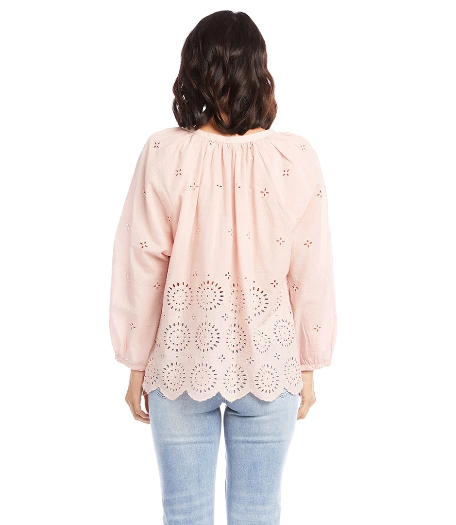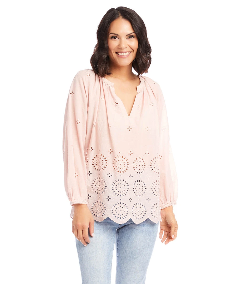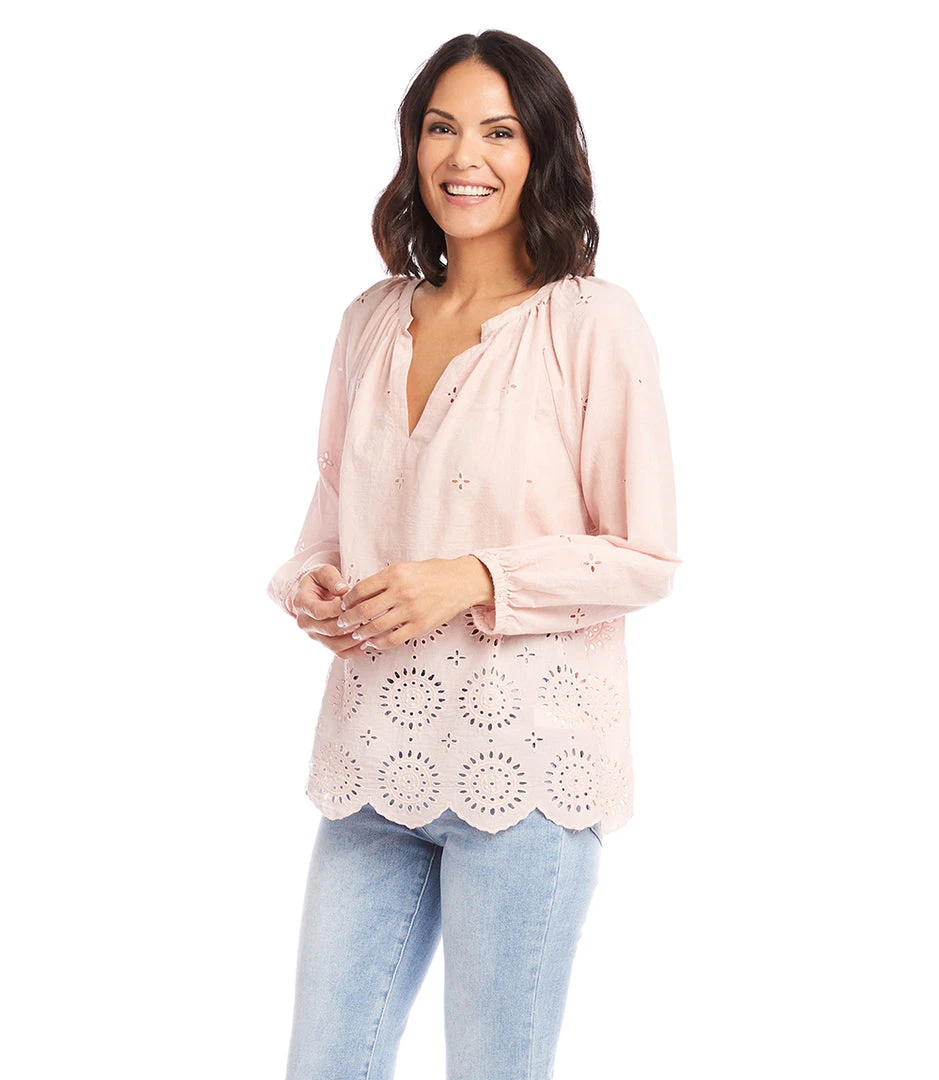 - Elevate your casual wardrobe with the Karen Kane Eyelet Border Peasant Top. This stylish blouse features a delicate eyelet border and a relaxed peasant silhouette, making it perfect for any casual occasion.