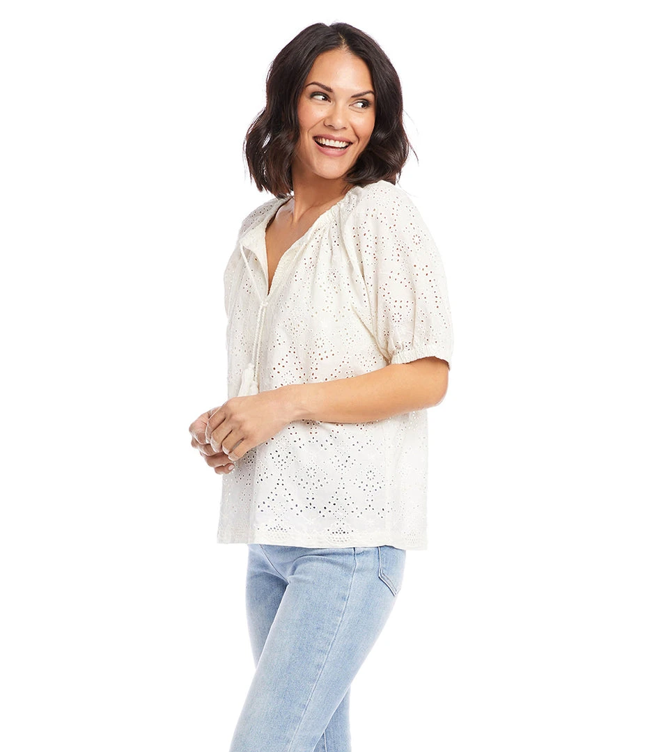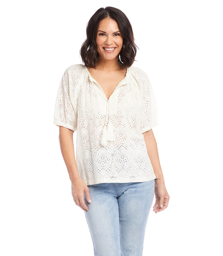 - Elevate your wardrobe with the Karen Kane Eyelet Embroidered Top, featuring intricate eyelet embroidery and a flattering silhouette for a chic look.