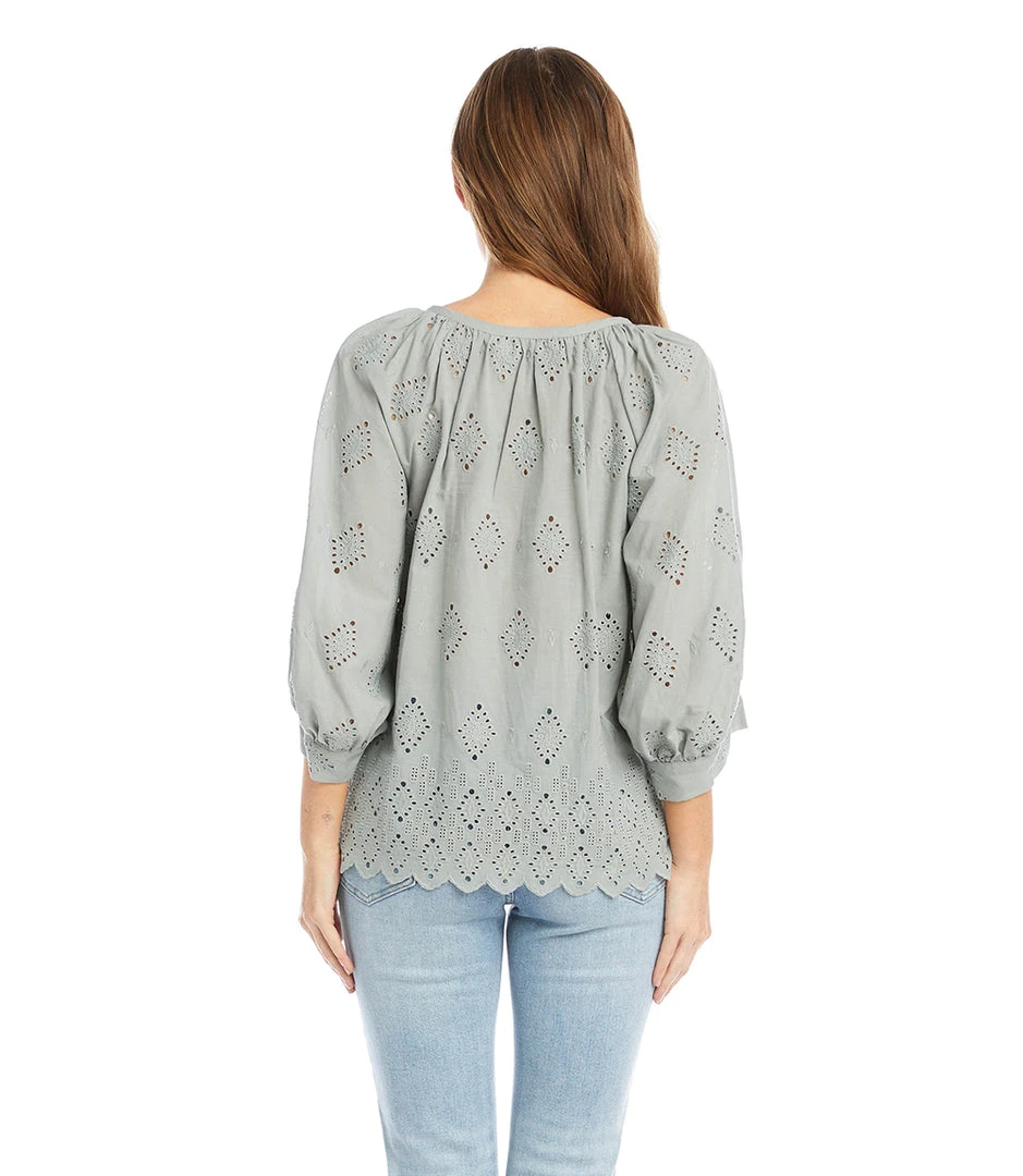 - Crafted from high-quality, breathable fabric, the Karen Kane Eyelet Peasant Top ensures all-day comfort. The lightweight material drapes beautifully, making it an ideal choice for warm weather.