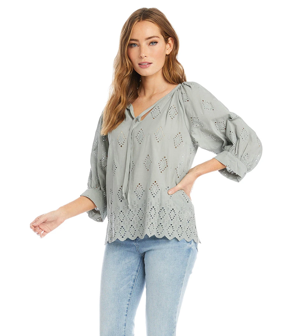 - Elevate your casual style with the Karen Kane Eyelet Peasant Top. Featuring delicate eyelet detailing and a relaxed fit, this top is perfect for a breezy summer day or a casual evening out.