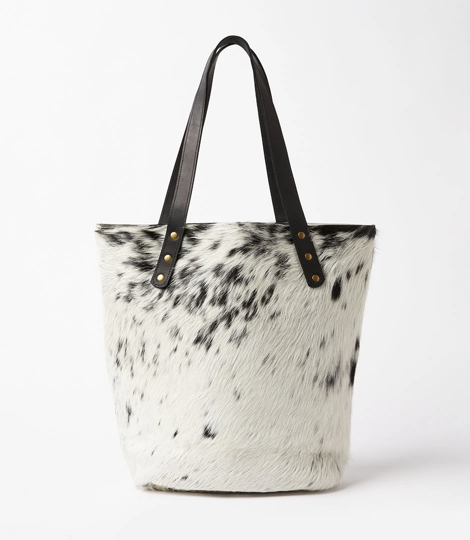 Add a western element to your look with this unique cowhide tote topped with soft leather handles. Hand-crafted by artisans in Kenya. Due to the handmade nature of this item, there will be variations in hides.