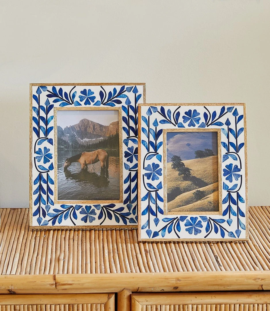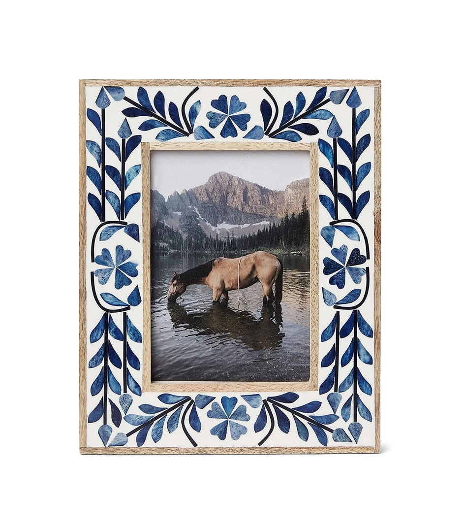 Handcrafted using a unique form of craftmanship, its indigo floral bone pattern is inlayed into a resin base for a lux look. It’s finished with subtle texture and shine. It’s completed with a rustic mango wood trim. Due to the natural characteristics of this item, each piece will have variances, no two are the same.