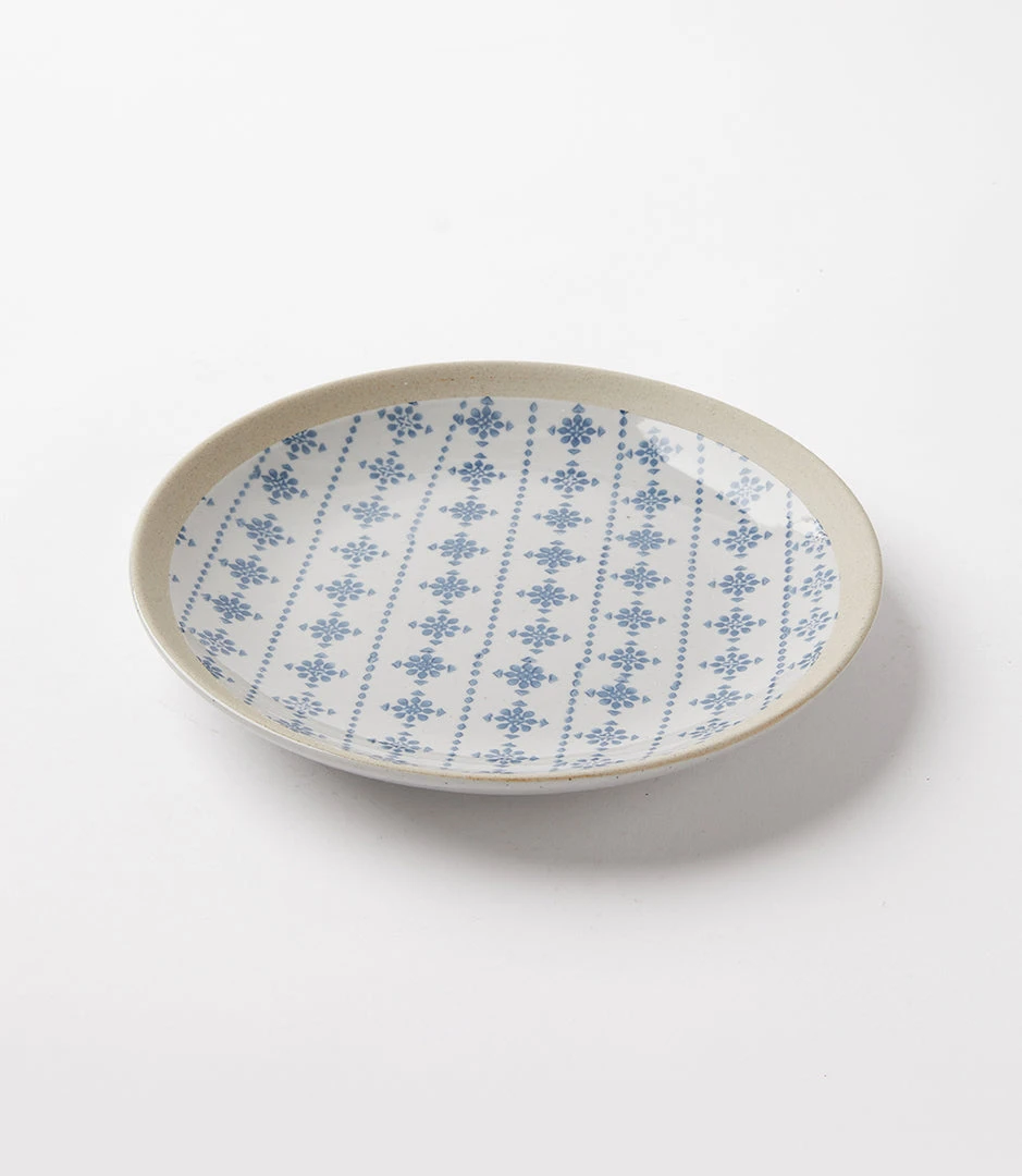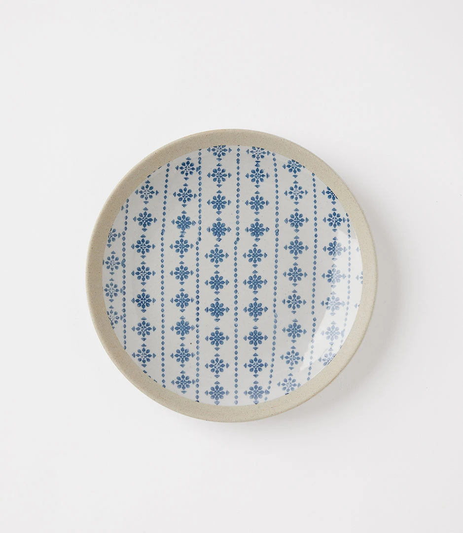 A beautifully glazed plate adorned with blue and white motifs. Available in four designs: daisy, floral, geometric, and ikat. Perfect for dinner al fresco, picnics, and meals shared with friends and family.