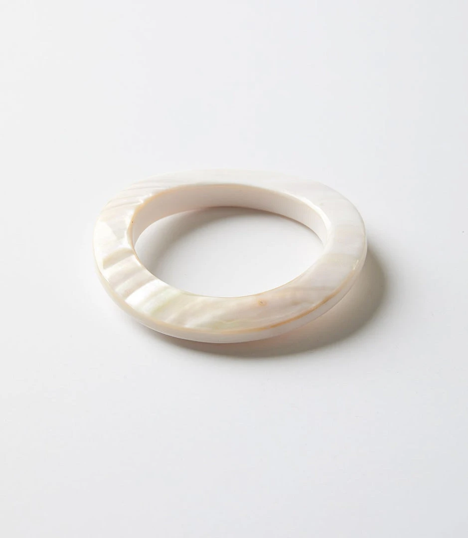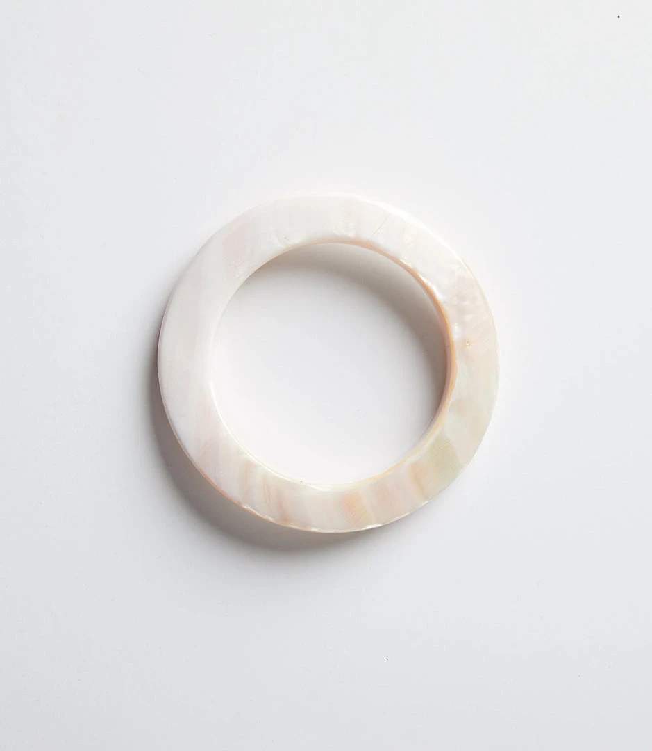 Seamlessly hand carved from a single piece of shell by master artisans, this mother-of-pearl bangle delivers timeless elegance. Due to the material and production process, slight variations in color, pattern, or texture may occur naturally. We invite you to embrace their uniqueness and imperfections.