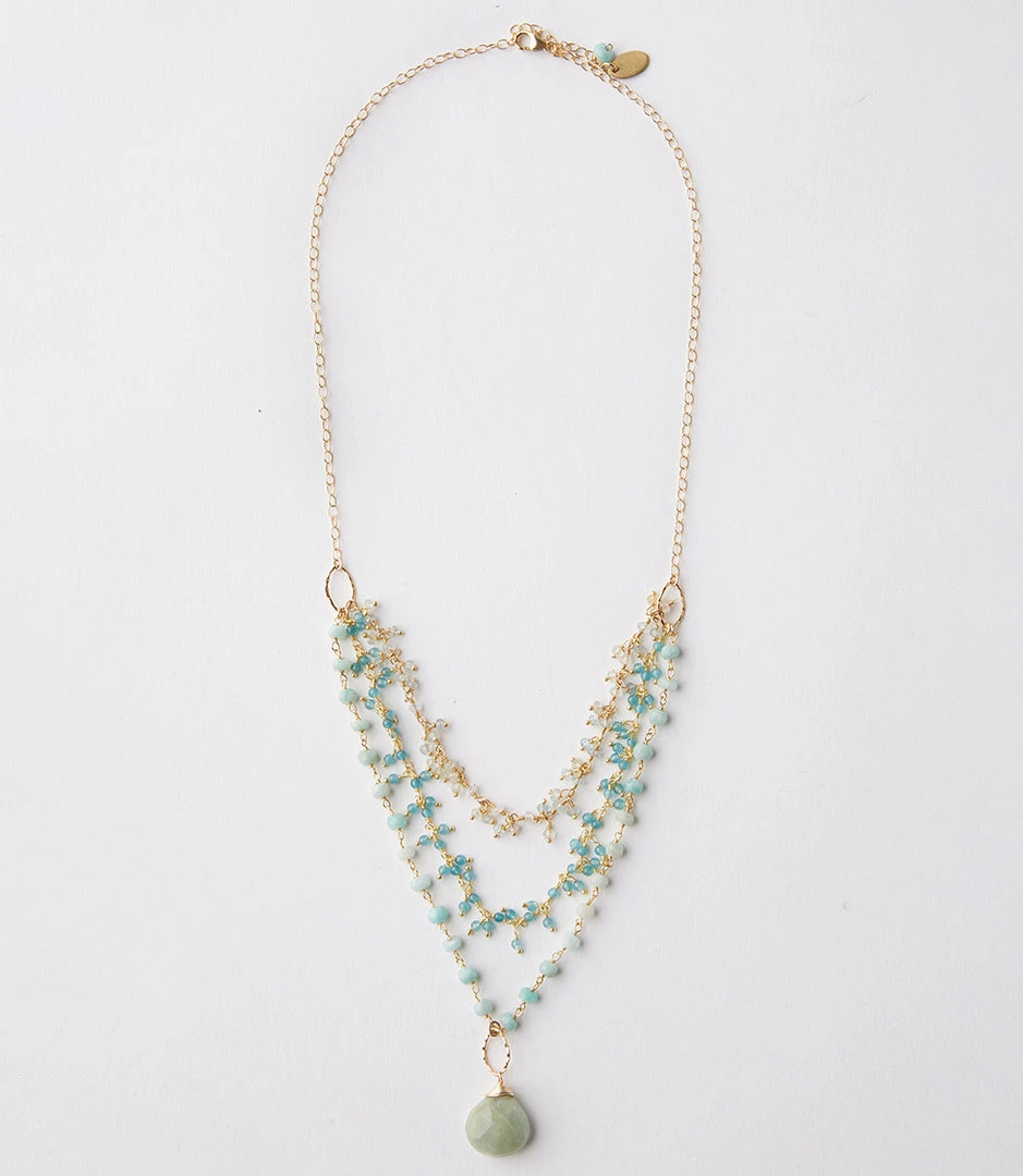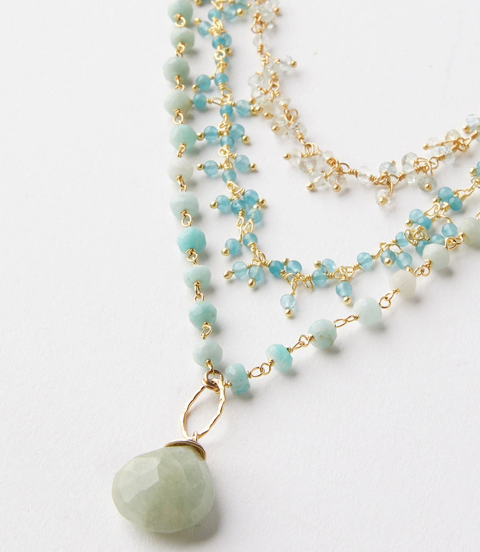 - Made of amazonite, apatite, and aquamarine on gold vermiel