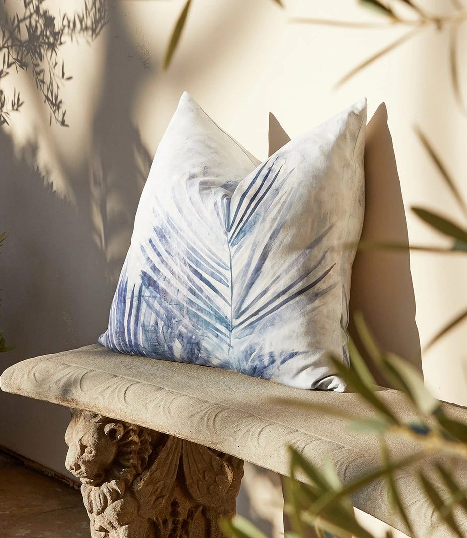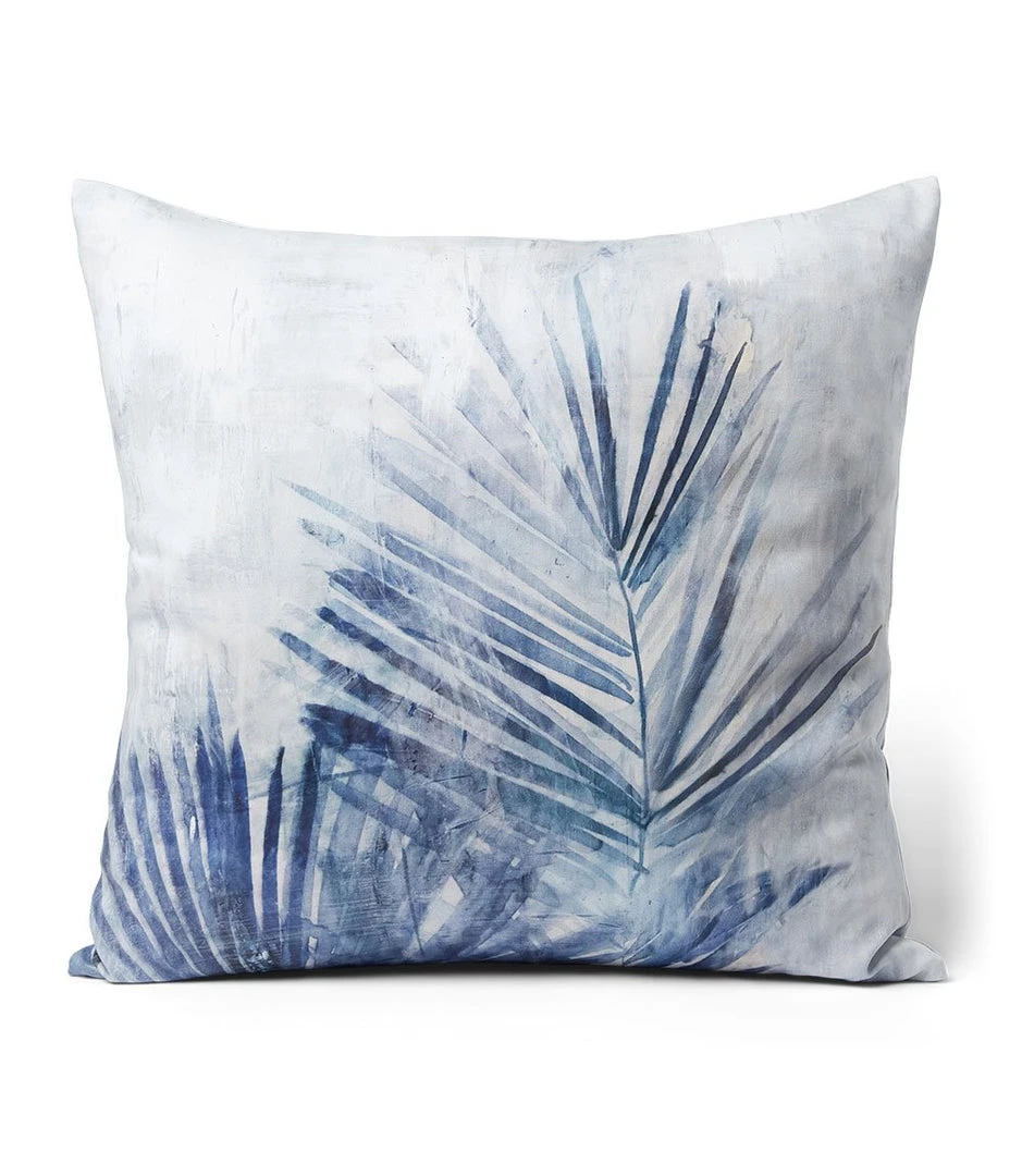 A monochromatic palm print brings luxurious visual texture to this cotton pillow. This plush pillow can be easily layered with natural toned pillows. Designed and crafted in Los Angeles. Includes pillow cover and feather insert. Due to the natural characteristics of this item, each piece will have variances, no two are the same.