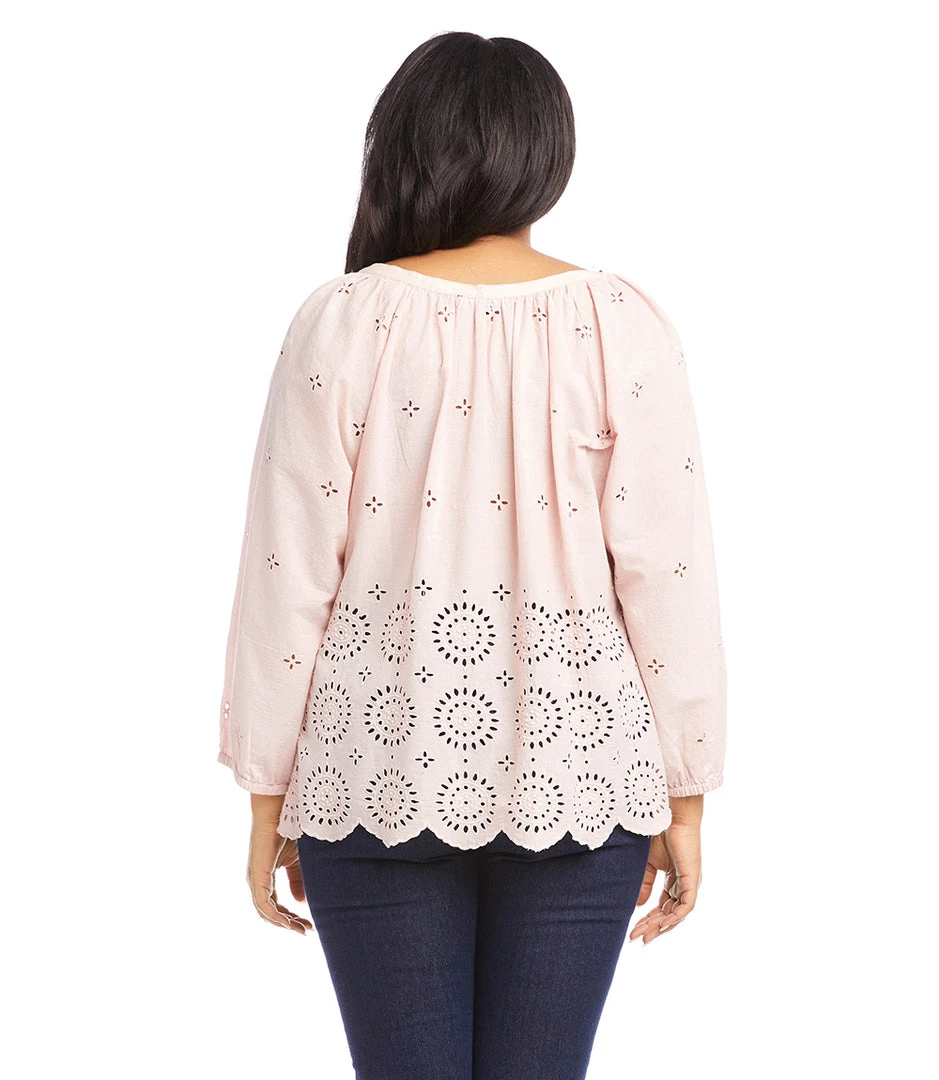 - Elevate your wardrobe with the Karen Kane Plus Size Eyelet Border Peasant Top. This stylish blouse features a flowy design and eyelet border detailing, perfect for casual outings or dressy occasions.