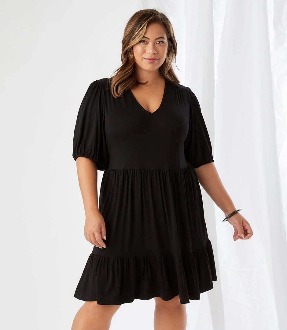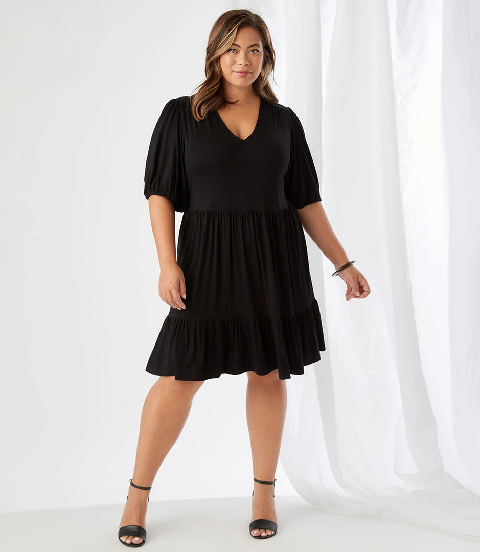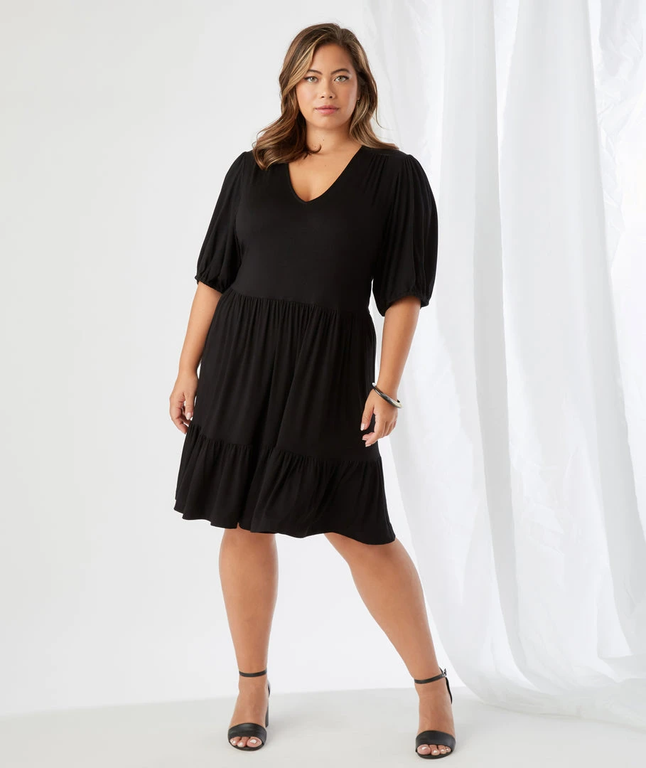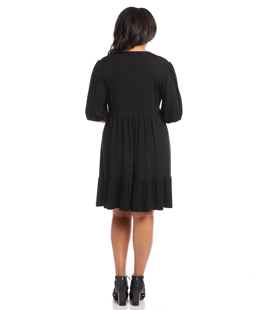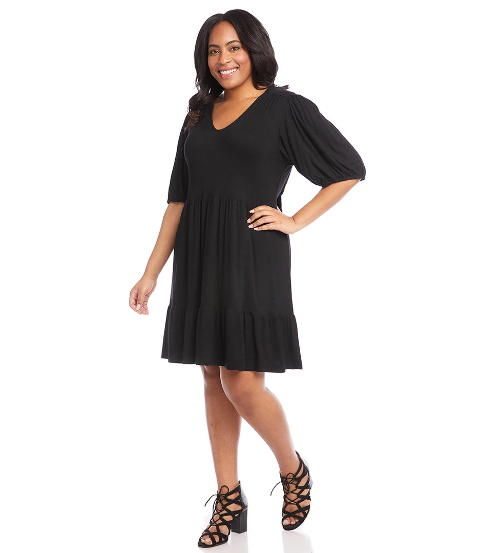 - Elevate your wardrobe with the Karen Kane Plus Size Poof Sleeve Tiered Dress. Designed for the modern woman, this dress combines style and comfort effortlessly.