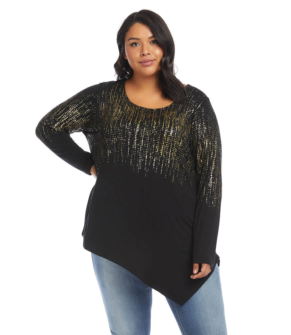 - Elevate your wardrobe with the Karen Kane Plus Size Printed Asymmetric Hem Top. This chic top features a unique printed design and an asymmetric hem for a modern, flattering look.
