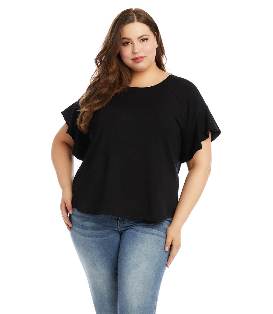 - Elevate your wardrobe with the Karen Kane Plus Size Ruffle Sleeve Top. This stylish blouse features elegant ruffle sleeves and a flattering fit designed for plus size women.