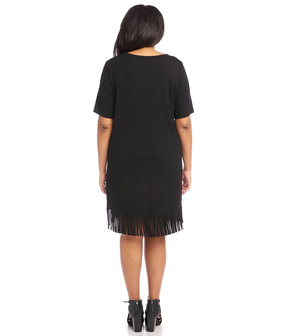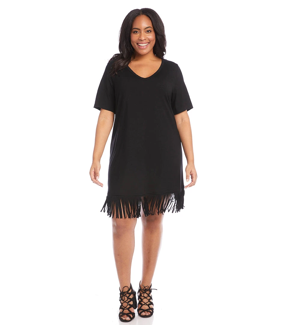 - Elevate your wardrobe with the Karen Kane Plus Size V-Neck Fringe Dress, designed to offer both style and comfort for women of all sizes.