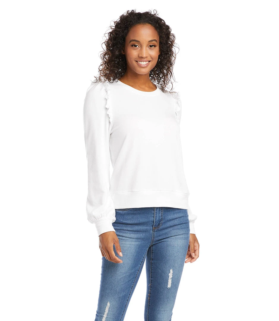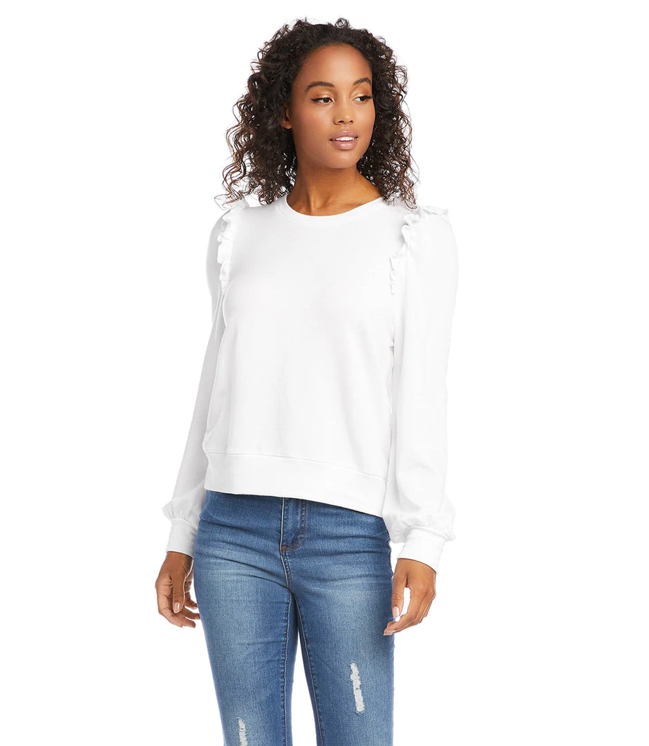 - Elevate your casual wardrobe with the Karen Kane Ruffle Detail Sweatshirt. This stylish pullover features unique ruffle detailing, offering a chic and feminine touch to your everyday look.