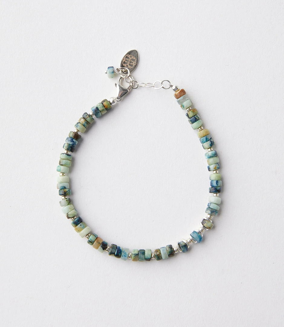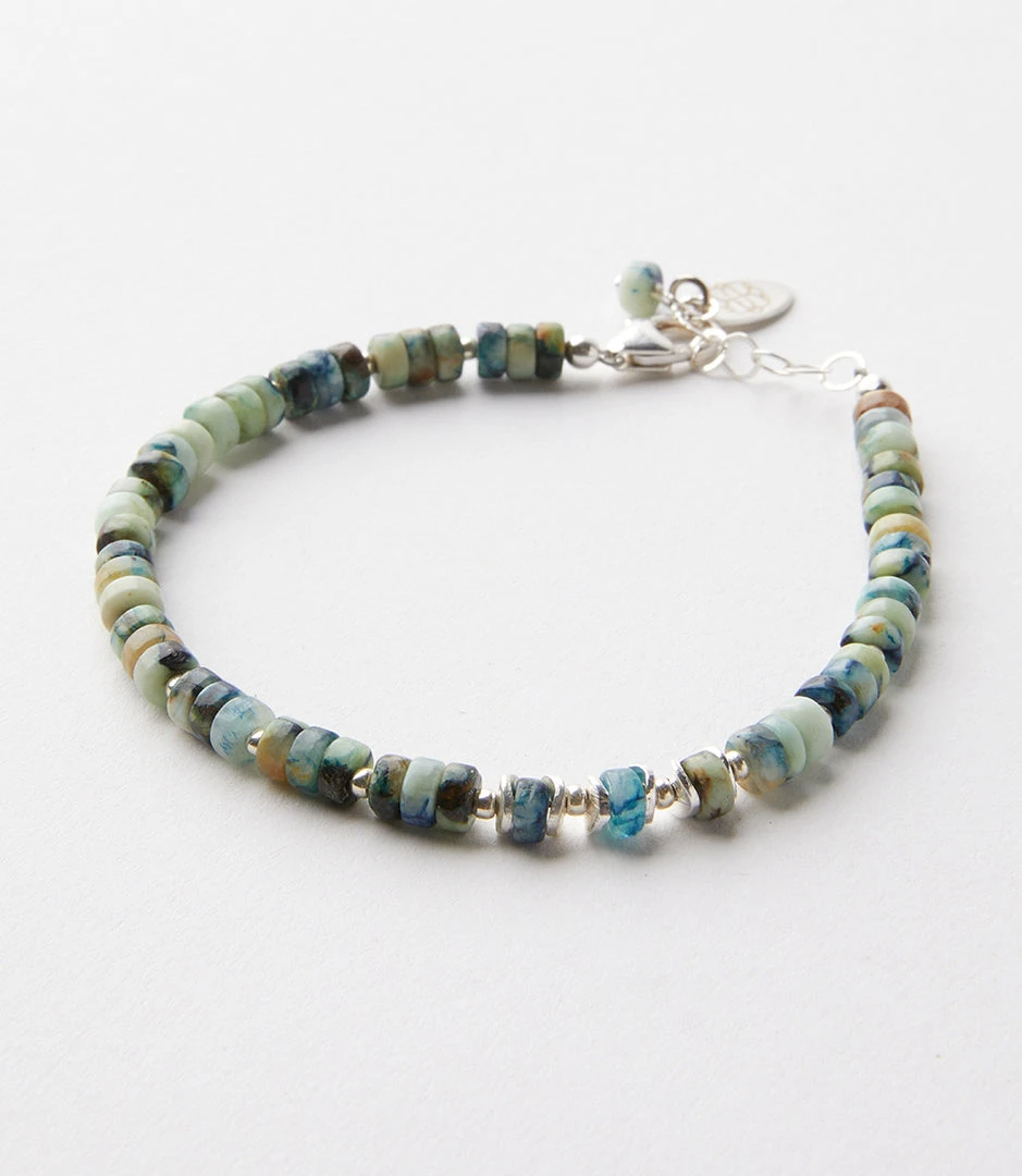 An assortment of colorful jasper gemstones nestle along sterling silver beads. This handcrafted bracelet makes for a special gift for a loved one.