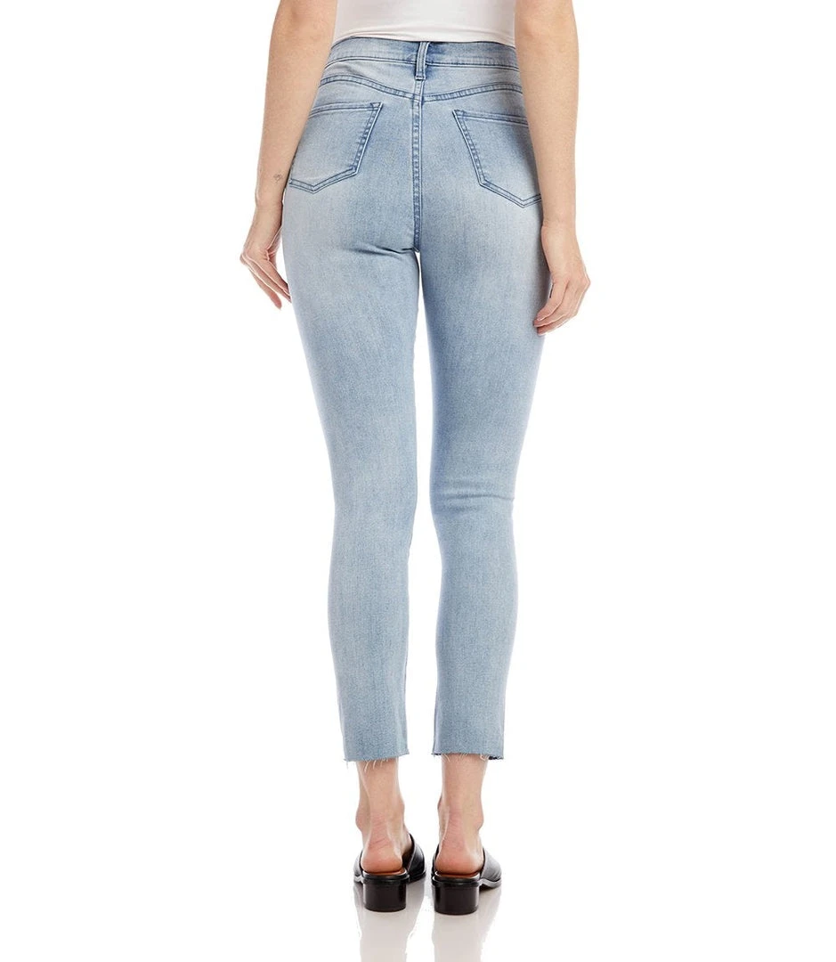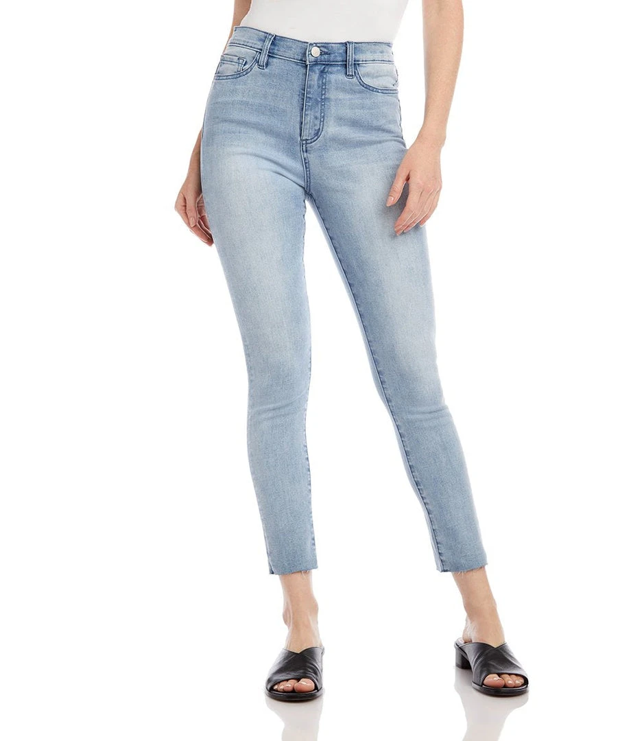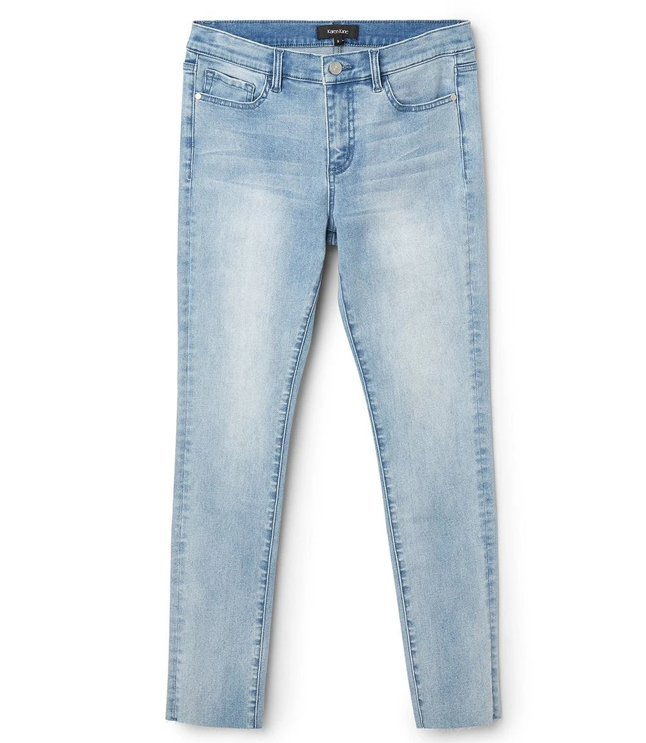 A faded blue wash, raw hem finish, and an ankle-grazing silhouette create the perfect go-to skinny jeans cut from stretchy denim.