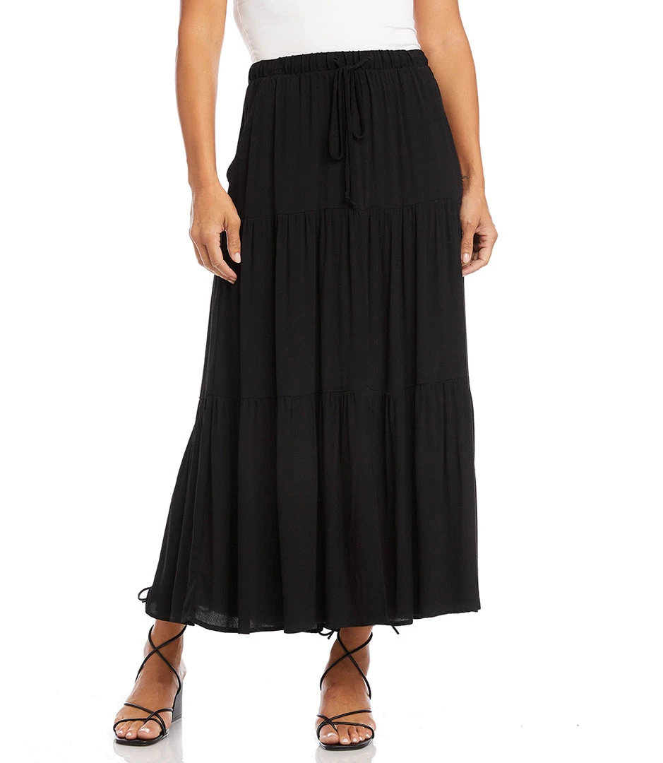 - The Karen Kane Tiered Midi Skirt is available in a range of sizes to ensure the perfect fit. Its elastic waistband provides a snug yet comfortable fit, making it easy to wear all day long.