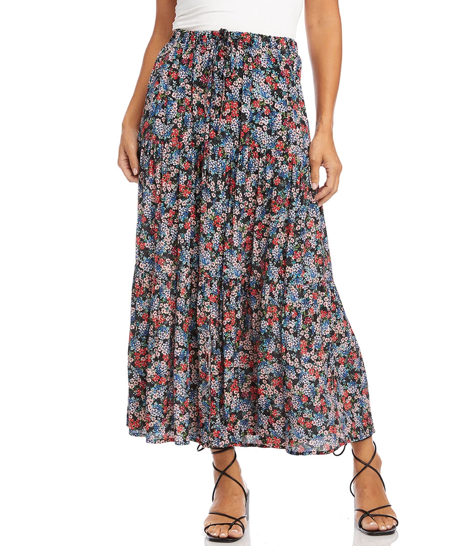 Take a walk in the garden in this free-flowing skirt featuring a fun ditsy floral print and an adjustable elastic waist. Breezy crepe fabric shapes a free-flowing silhouette of a essential midi skirt patterned with a beautiful garden floral print. Its tiered hem enhances the bohemian charm.