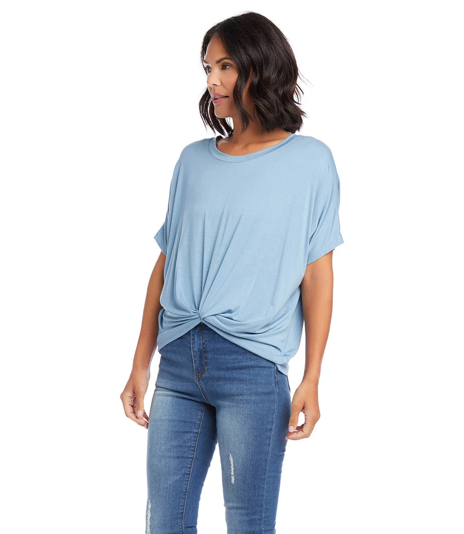 - Elevate your casual wardrobe with the Karen Kane Twist Front Top. Featuring a unique twist design, this top combines style and comfort effortlessly.