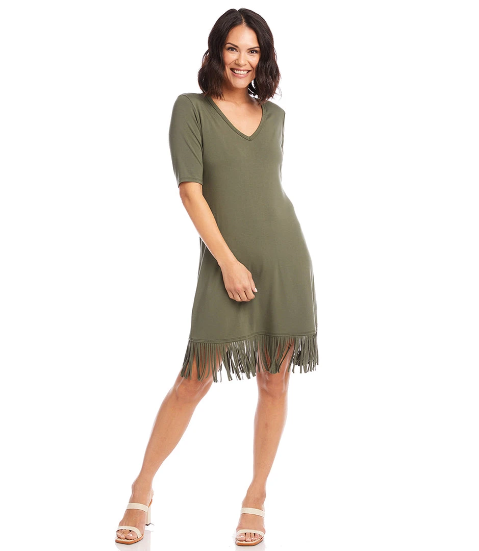 - The Karen Kane V-Neck Fringe Dress features a flattering V-neck design and trendy fringe details, making it a versatile piece for any occasion.
