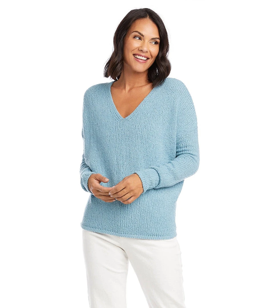 - Experience ultimate comfort with the Karen Kane V-Neck Pullover Sweater, crafted from soft, high-quality fabric that feels luxurious against your skin.