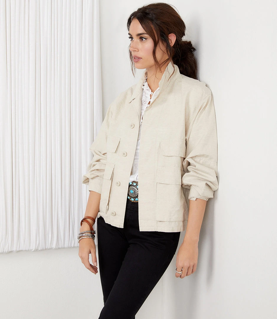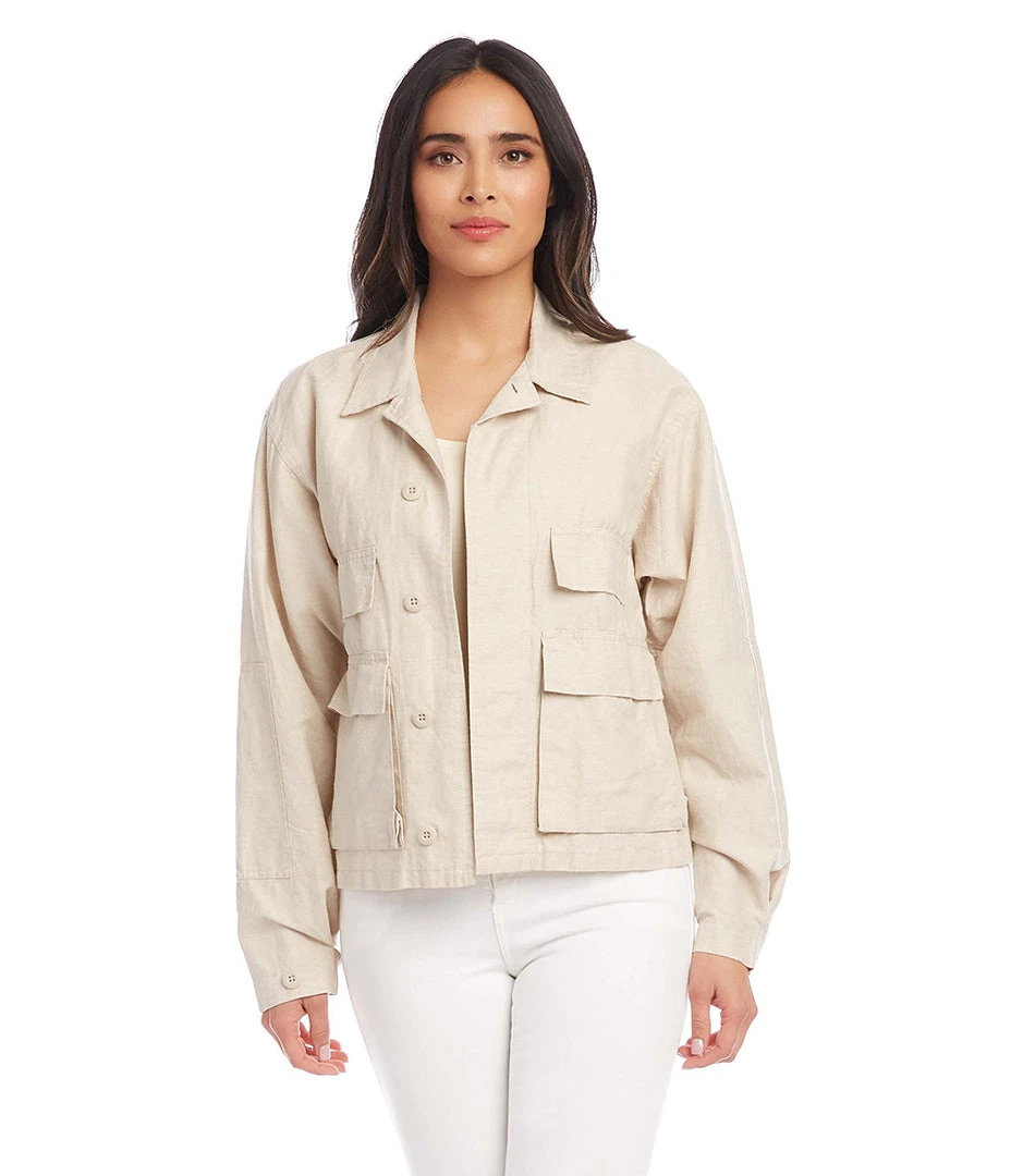 - Crafted from high-quality materials, the Karen Kane Cargo Jacket ensures durability and comfort. Its lightweight construction makes it an ideal choice for layering during cooler months or as a standalone piece in mild weather.